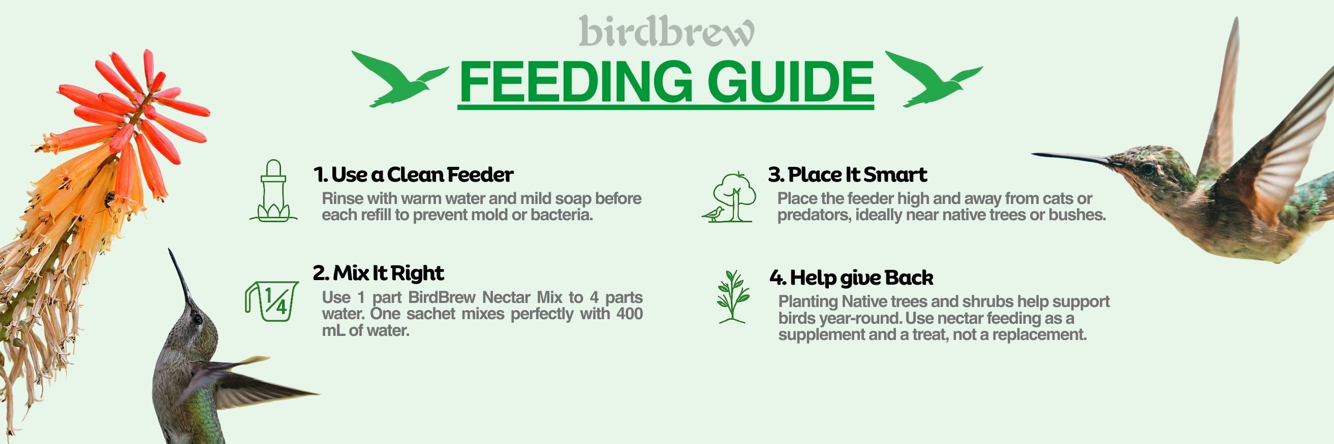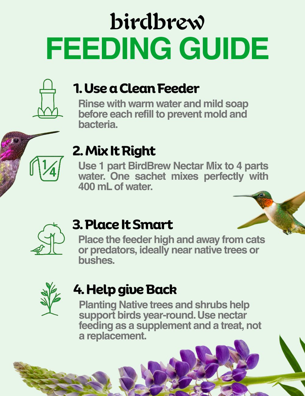 Just mix one sachet of BirdBrew Nectar Mix with four cups of warm water, stir until fully dissolved, and pour into a clean feeder placed near native trees or shrubs. Rinse your feeder with warm soapy water before each refill to keep your backyard birds safe and healthy.